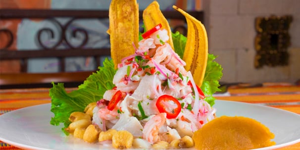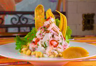 Trozos De Toyo Con Mixtura De Mariscos Ahumado Marinado Con Sal, Limón Y Culantro Bañado En Crema O Salsa De Aji Escabeche