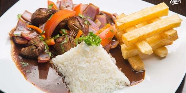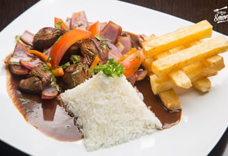 Jugosos trozos de lomo salteados al wok con cebolla, tomate y sillao. Servido con papas doradas y arroz blanco graneado.