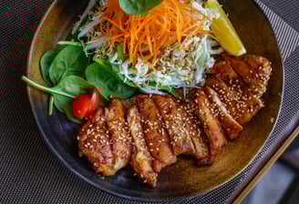 Filete de pollo al grill en salsa parrillera acompañada de papitas cóctel crocantes y choclo frito.